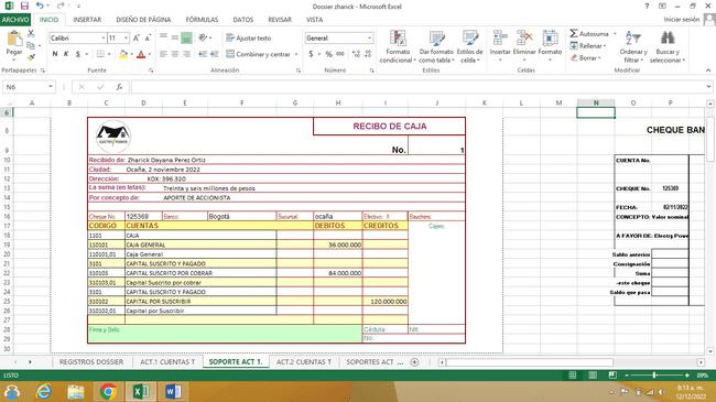 de $ 10.000 cada uno pagando el 30%, la empresa recibe el dinero con cheque No. 125369 del Banco Bogotá Recibo de Caja No.____1