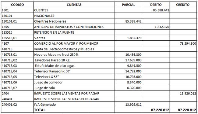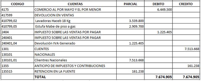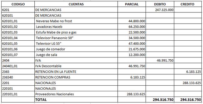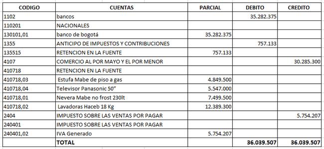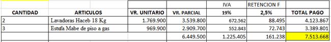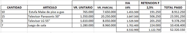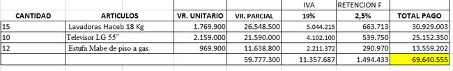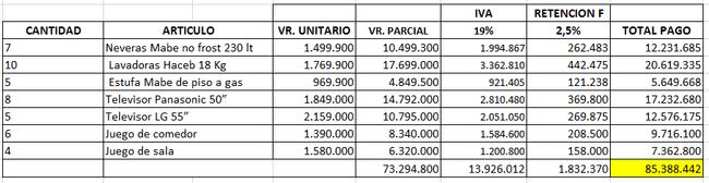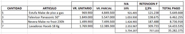 CANTIDAD V/R TOTAL 5.649.668 Televisor Panasonic 50´´ 3 6.462.255 Nevera Mabe not frost 230lt 5 8.736.918 Lavadoras Haceb 18kg 7 14.433.535 Estufa Mabe de piso a gas 5