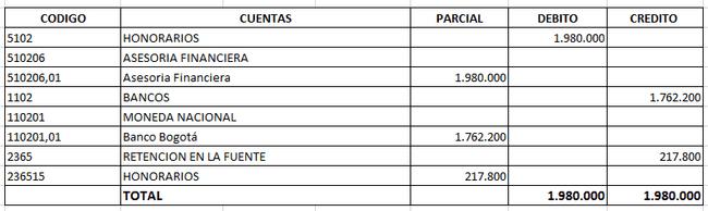 13. El 30 de Noviembre se cancela al Contador Público Alberto Morante los honorarios por su asesoría contable por valor de $ 1,980.000, girando cheque del Banco Bogotá No.____10____CE____11_____ R.F_2.5______