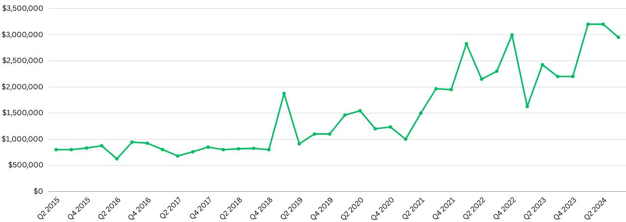 The market exhibited resilience, as the median sale price increased by 34% to $2.9 million, and the maximum price sold rose by 35%. Despite these positive trends, current inventory saw a 10% decrease, and pending transactions fell 57%, indicating a slowdown in buyer activity. Additionally, the average days on market increased by 20%, reflecting a shift in the pace of sales within this segment.