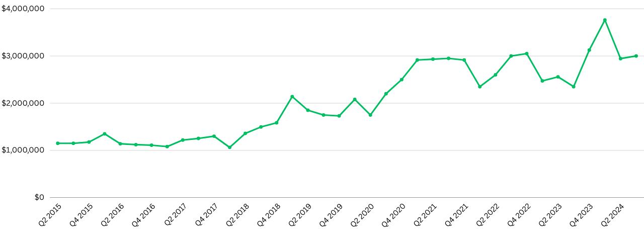 Conversely, the vacant land segment has faced challenges, with 32 transactions representing a significant 29% decrease. Total dollar volume for vacant land fell by 15%, totaling $224.6 million. Nevertheless, the median sale price increased by 34% to $2.9 million, and the maximum price sold rose by 35%, because of the diminishing quantity of lower priced lots. As a result of