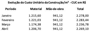 A composição do Custo Unitário da Construção - CUC, na cidade de Belo Horizonte, em abril, de acordo com o CEEA, fechou em R$2.269,10 o m², correspondendo a R$1 206,70 à parcela dos materiais e a R$941,12 à parcela de mão-de obra.