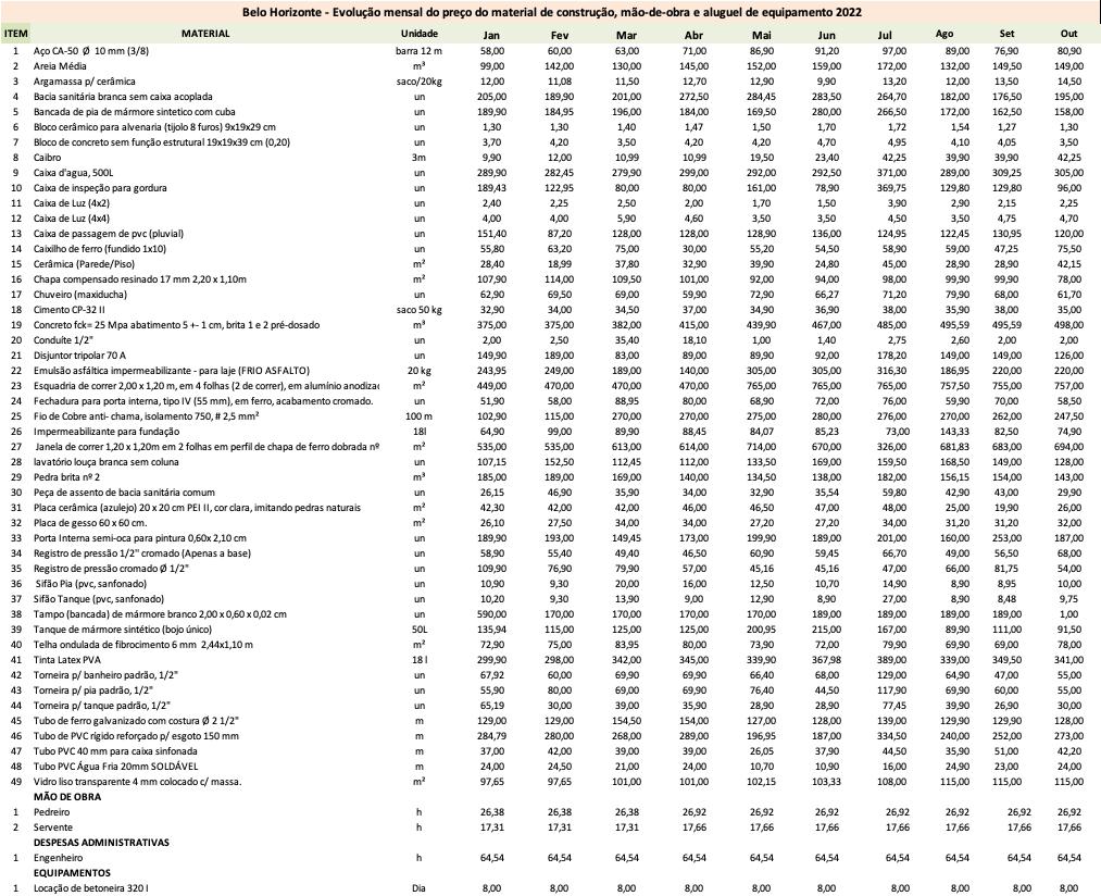 BELO HORIZONTE PREÇO E VARIAÇAO DO PREÇO DO MATERIAL, MÃO DE OBRA E EQUIPAMENTO