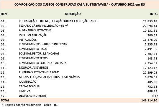 Custo e Composição do custo da construção de uma Casa sustentável .