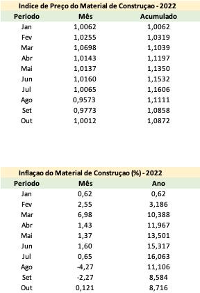 O custo nacional da construção, por metro quadrado, que em setembro fechou em R$ 1.669,19, passou em outubro para R$ 1.675,46, sendo R$ 1000,36 relativos aos materiais e R$ 675,10 à mão de obra. A parcela dos materiais apresentou taxa de 0,04%, mantendo a tendência de desaceleração observada nos últimos meses. Essa variação no setor de materiais de construção é a menor observada desde janeiro de 2020. Com relação ao mês anterior (0,53%) houve queda de 0,49 ponto percentual, e observando outubro de 2021 (1,27%), o índice caiu 1,23 pontos percentuais. Já a mão de obra, registrou índice de 0,88%, subindo 0,57 ponto percentual em relação ao mês anterior (0,31%), influenciada por 4 2 acordos coletivos firmados no período. Comparando com outubro do ano anterior (0,64%), houve aumento de 0,24 ponto percentual. Os acumulados de janeiro a outubro foram: 9,93% (materiais) e 11,70% (mão de obra). Já os acumulados em doze meses ficaram em 12,60% (materiais) e 12,07% (mão de obra), respectivamente.