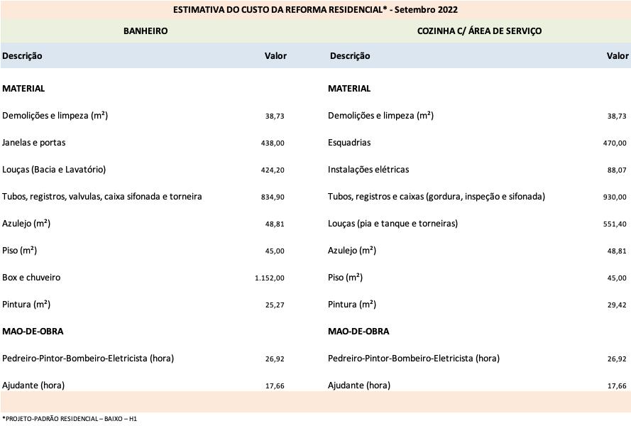 Acima são apresentados os custos com a reforma de um banheiro e de uma cozinha com área de serviço, na cidade de Belo Horizonte, calculado pelo Centro de economia e estatística aplicada CEEA