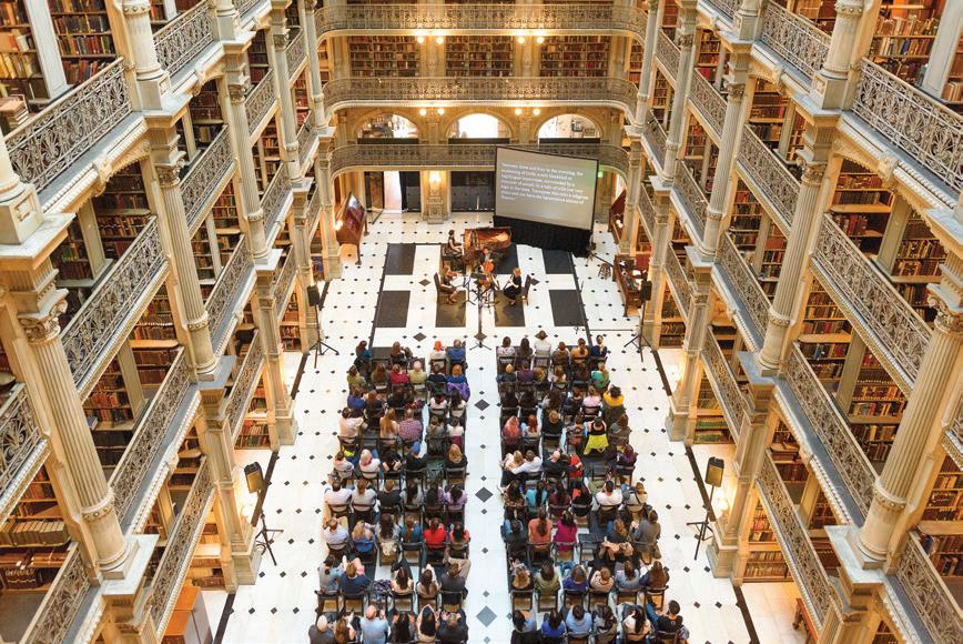 All photos by Will Kirk/Johns Hopkins University unless otherwise noted. Front Cover & Page 3: Candid photograph of a class, undated, Special Collections, Johns Hopkins Sheridan Libraries Page 2: Elisabeth Long. Page 4: Whooping Crane, Grus americana by Sarah Kaizar, 2023. Page 5, top to bottom: Sheet music cover for “J’ai deux Amours,” published by Éditions Salabert Paris, 1930, Special Collections, Johns Hopkins Sheridan Libraries; Lotus Blossom by Lindsay Adams, 2025, Courtesy of the artist, photo by Sloane Prince/Johns Hopkins University. Page 6: Interior View of Homewood House, undated, Special Collections, Johns Hopkins Sheridan Libraries. Page 10, top to bottom: Courtesy of Jonhs Hopkins University Press; Picture of Homewood House being held by Milton Eisenhower, July 19, 1962, Morton Tadder, Special Collections, Johns Hopkins Sheridan Libraries Page 11: Workers at Evergreen, undated, Evergreen House Foundation Collection. Page 12: Courtesy of ZiggyandMiles.com. Page 13: Matthew Petroff. Page 15: Sydney Allen. Page 16, top to bottom: Mahalia Jackson performing at a church, 1949, Paul S. Henderson Photograph Collection, Maryland Center for History and Culture; Courtesy of Murder Mystery Co. Page 17, bottom: Mike Ciesielski. Page 18, top: “Male and Female Dancer,” by Léon Bakst, 1923, print of a watercolor drawing. Evergreen House Foundation; bequest of Alice Warder Garrett. Page 19, top: Dominique Zeltzman.