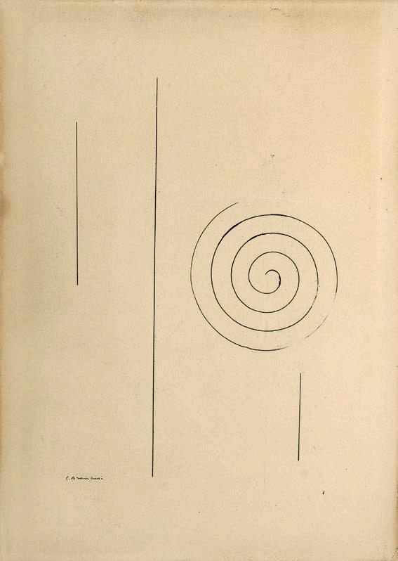 Le Portrait of James Joyce se traduit par une composition abstraite dominée par une spirale centrale, associée à des lignes verticales rigoureuses structurant l’espace de la feuille. Cette image ne représente pas Joyce : elle pense Joyce. Elle constitue une transposition plastique de son œuvre, fondée sur la répétition, la dérive et l’impossibilité de toute lecture linéaire. Brancusi explicita lui-même cette image à l’artiste Jacques Hérold, déclarant : « Joyce est comme cela : il part d’un point, et vous ne le rattraperez jamais ». Cette phrase éclaire la spirale qui domine la composition, conçue comme la métaphore visuelle d’une pensée en expansion continue, insaisissable et profondément moderne.