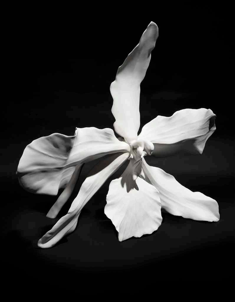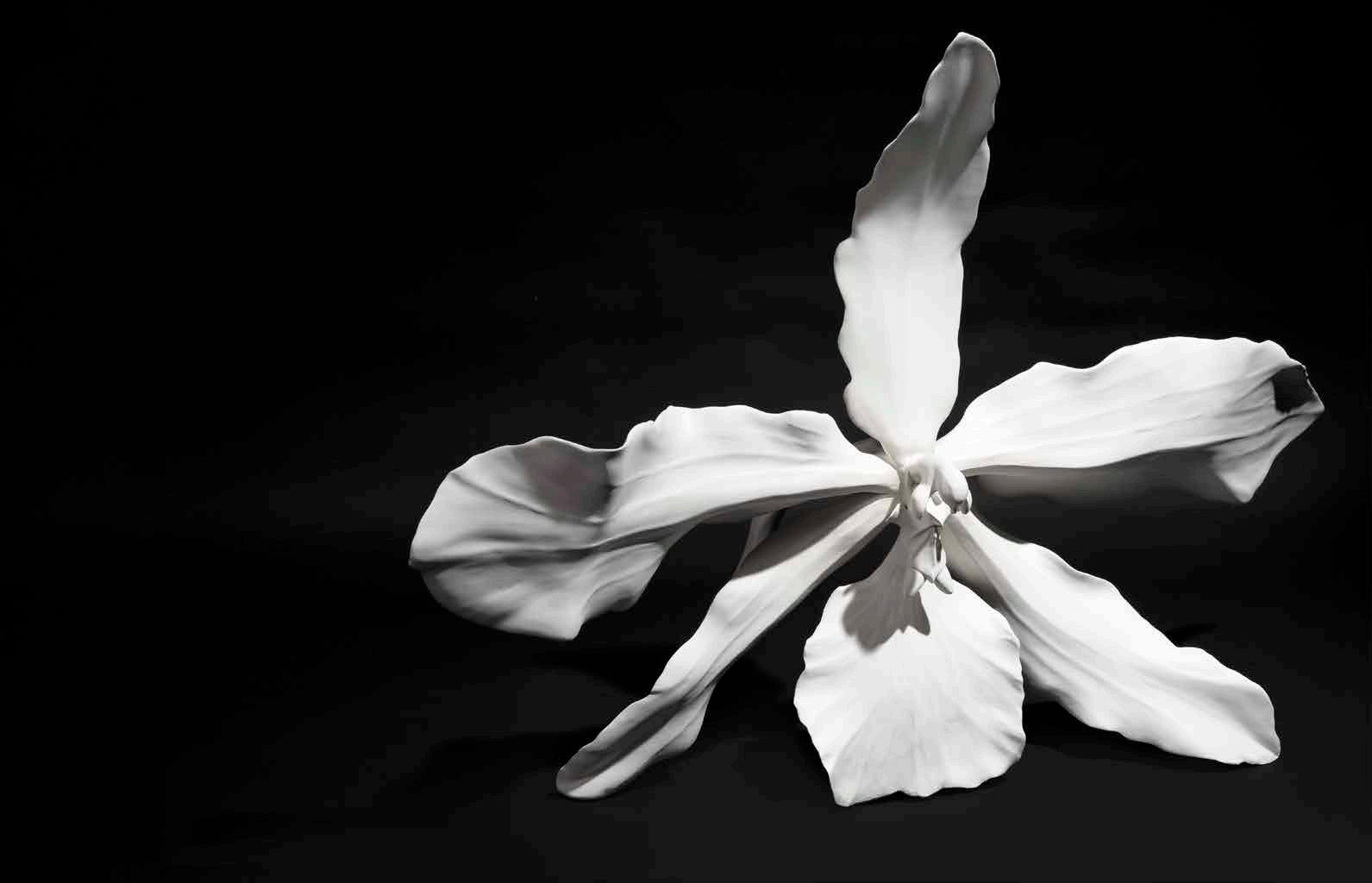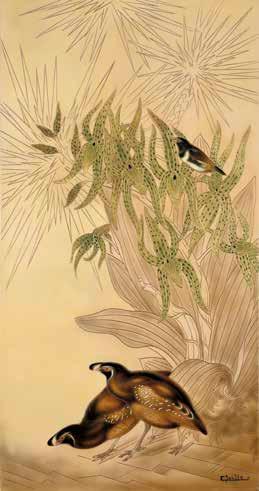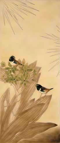 Laque gravée, fond en laque ivoire, ophrys en fleurs à la feuille d’or