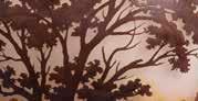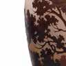 Épreuve en verre multicouche à décor repris à l’acide brun rouge sur fond orangé d’un paysage lacustre arboré