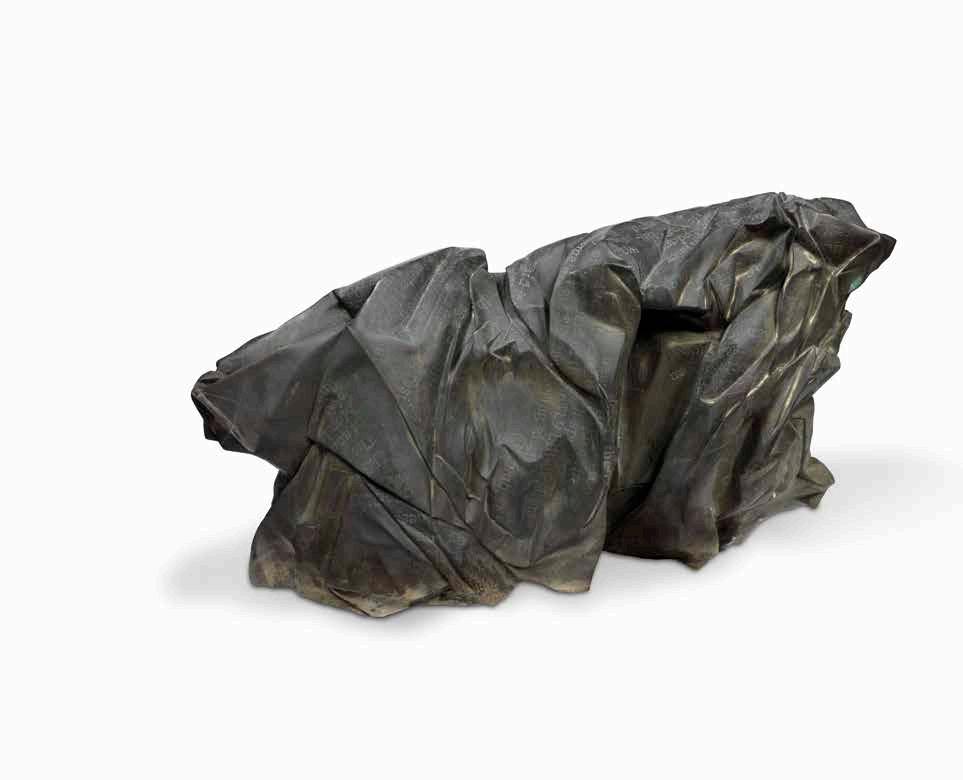 Pour la première fois, Li Lihong intègre également un nouveau matériau, l’acier inox, matériau né en Europe et importé tardivement en Chine. Le traitement de l’inox en surface « peinte » (ici recouvert d’un vernis bleu), lisse et brillante, véritable clin d’œil au sculpteur pop Jeff Koons, contraste fortement avec le rendu décoratif de la peinture traditionnelle apposée sur une peinture en trompe l’œil imitant à la perfection les céramiques de l’artiste.