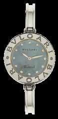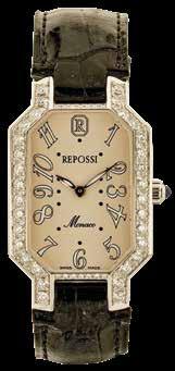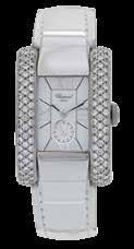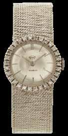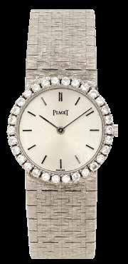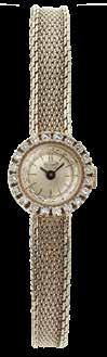 Montre bracelet pour femme en or blanc 18k (750), lunette sertie de diamants taille brillant, cadran blanc, index bâtons appliqués formant les heures, mouvement à remontage mécanique, bracelet intégré en or blanc 18k (750) avec sa boucle signée. Cadran, boîtier et mouvement signés.