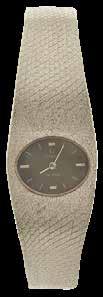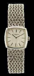 Montre bracelet pour femme en or blanc 18k (750), cadran gris, index bâtons appliqués formant les heures, mouvement à remontage mécanique calibre 485, n°29510738, bracelet intégré en or blanc 18k (750) avec sa boucle siglée (manque le remontoir).
