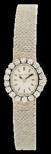 Montre bracelet pour femme en or blanc 18k (750), lunette sertie de diamants taille brillant, cadran blanc, index bâtons appliqués formant les heures, mouvement à remontage mécanique, bracelet en or blanc 18k (750) serti de diamants.