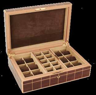 Coffret de rangement en marqueterie de bois pouvant accueillir douze montres et centré d’un compartiment de rangement pour boutons de manchette (une rayure sur le dessus de la boîte).