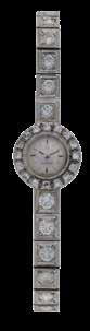 Montre bracelet pour femme haute joaillerie en or blanc 18k (750), lunette sertie de diamants taille brillant, cadran blanc, index bâtons appliqués formant les heures, mouvement à remontage mécanique, bracelet en or blanc 18k (750) entièrement serti de diamants taille brillant pour environ 3 carats.