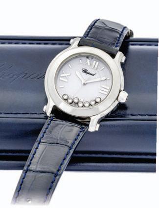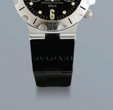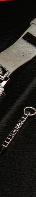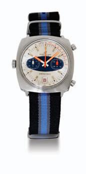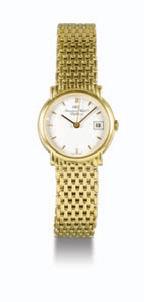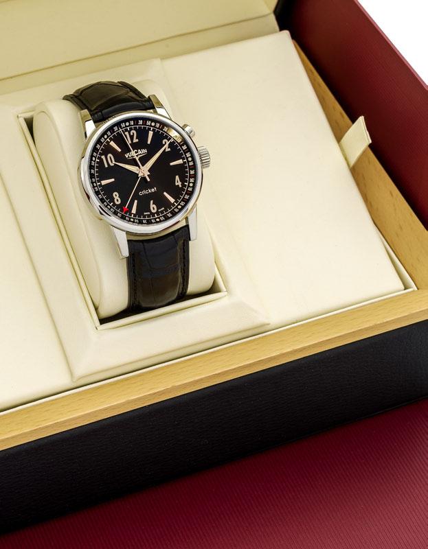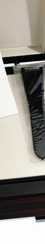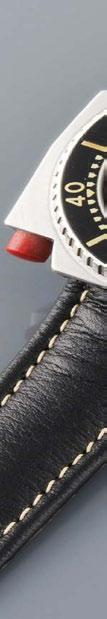 Carrure ovale, pied retractable. Cadran blanc, chiffres romains regardant au centre, aiguilles forme Epée, aiguille blanche au centre pour l’alarme. Calibre à quartz.