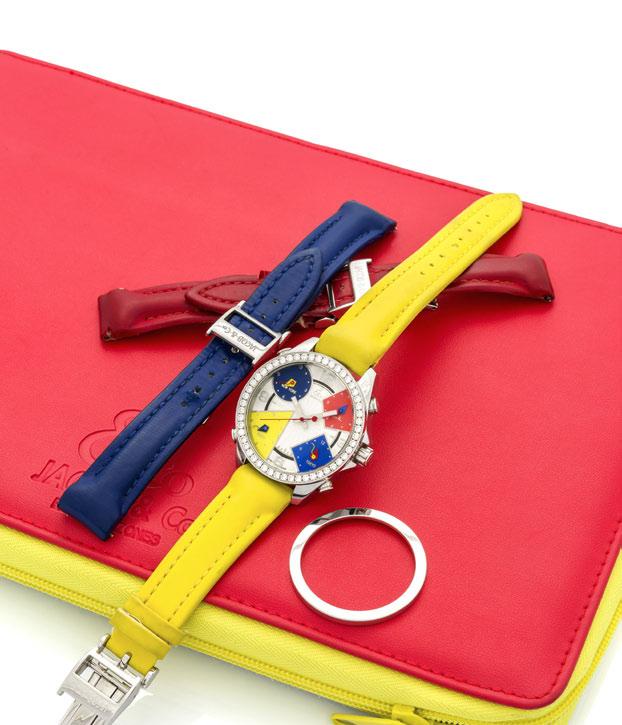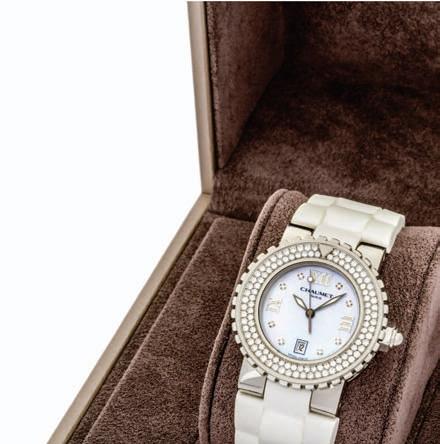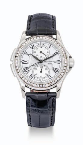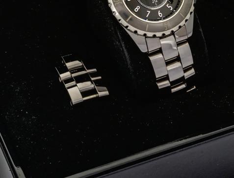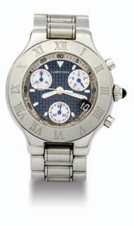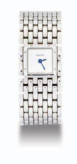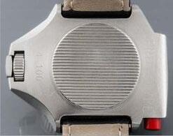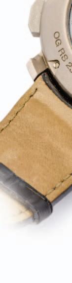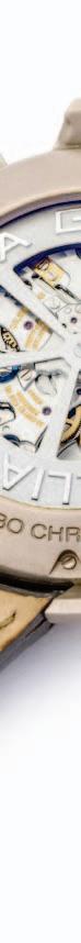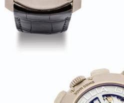 Cadran blanc avec chiffres romains regardant au centre, division en chemin de fer pour les minutes, aiguilles lumineuses, aiguille blanche co-axiale pour l’alarme. Calibre 21903 à quartz.