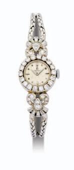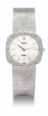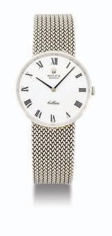 Carrure forme tonneau, lunette cannelée en or gris, couronne vissée, fond vissé, glace en hésalite (rayée) avec loupe pour la date. Cadran argenté avec index bâton en or jaune en applique, aiguilles en or de forme bâton lumineuses, seconde au centre, date à 3h. Calibre 1570, mécanique à remontage automatique, certifié chronomètre, 26 rubis, spiral Breguet, antichocs. Sur bracelet acier Rolex Jubilé avec boucle déployante, maillons de fin ref. 555, boucle ref. 62510H. Longueur approx. du bracelet 180 mm. Cadran, mouvement et boîtier signés.