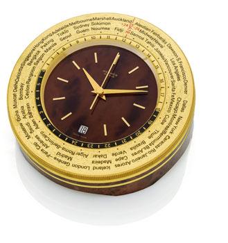 Belle, rare et inhabituelle, pendulette de table, en laiton doré, à quartz, indiquant les heures du monde, avec un cadran couleur oeil de tigre. Carrure ronde, lunette tournante doré portant les noms des villes, verre plexi rond. Cadran rond, couleur oeil de tigre, index forme baton dorés en applique, aiguilles type dauphine, seconde au centre, ouverture pour la date à 6h. Calibre rond à quartz.