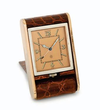 A very fine, 8-days, mechanical, rectangular leather-coated and gilt metal travel clock with alarm.