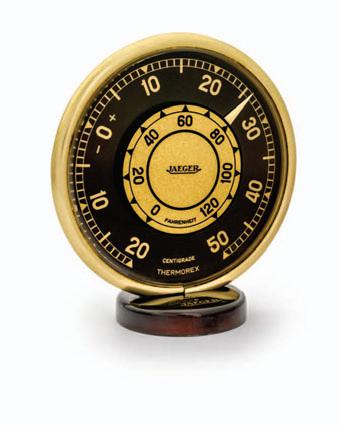 Inhabituel thermomètre de table en laiton doré, rond, avec indication en centigrade et en fahrenheit.