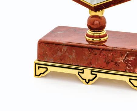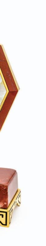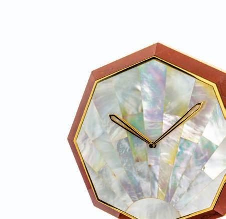 cartier, Paris, boîtier no. 199972, vers 1980. Belle et rare, pendule de table de style Art Deco, en jaspe sanguin, nacre, émail et laiton doré, à quartz. Carrure octogonale, à pans inclinés en pierre, cadres octogonaux en laiton doré, sur pied avec plusieurs anneaux et boule en pierre, socle rectangulaire en pierre, avec support et pieds stylisés en laiton doré et émail noir, de style Art Deco. Cadran en mosaïque de nacre formant un motif rayonnant depuis la base, aiguilles dorées. Calibre à quartz. Boîtier et mouvement sont signés.