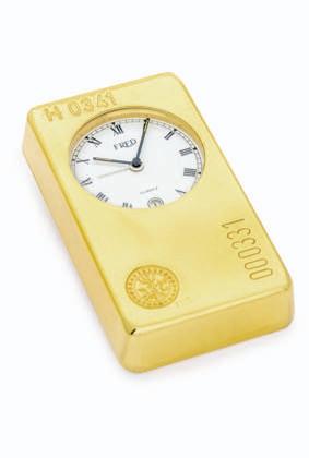 An unusual, gilt brass, quartz ingot-shaped desk clock with alarm, by Fred.