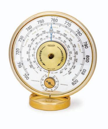A fine large gilt brass barometer with thermometer by Jaeger.