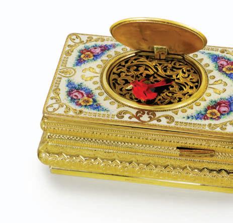 Carrure rectangulaire, panneau supérieur émaillé, couvercle ovale peint avec une scène de bord de lac, remontage dans le socle, poussoir coulissant pour actionner le mécanisme.