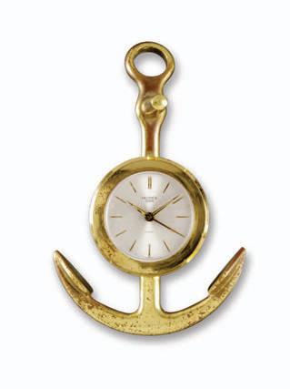 A nice and unusual anchor shaped table clock with 8-days mechanical movement and alarm, by Hermès, Paris.