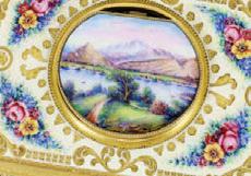 Superbe et rare, boite à oiseau chanteur en laiton doré et email peint, représentant une vue du lac de Genève.