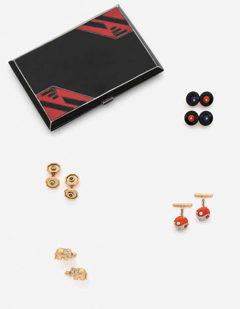 En or jaune, onyx, demi-perles de corail et de lapis-lazuli ponctuées d’un diamant rond serti clos.