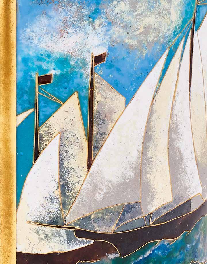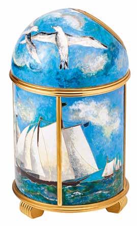 A small blue and white enamel amphora hiding a clock, by Juvenia.