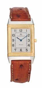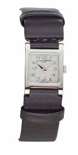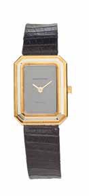 Montre bracelet de femme en deux ors blanc et jaune 18K (750) de forme rectangulaire, cadran de couleur gris, mouvement à quartz, bracelet en cuir avec sa boucle ardillon en deux ors 18K (750) signée. Cadran, boîtier et mouvement signés.