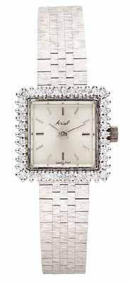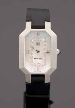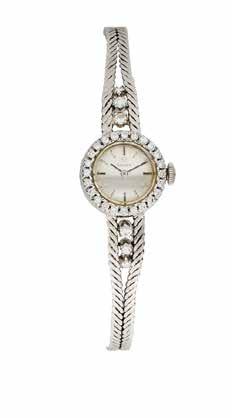Montre bracelet de dame en or gris 18K (750), cadran blanc, index bâtons appliqués, lunette sertie de diamants, mouvement à remontage mécanique, bracelet intégré à maille en or gris 18K agrémenté de six diamants.
