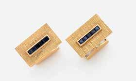 PAIRE DE BOUTONS DE MANCHETTE en or jaune satiné, sertis clos d’une ligne de saphirs calibrés. Poids : 12,4 g (18K - 750/1000).