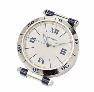 CARTIER, PASHA VERS 1990, Pendulette de bureau en métal et laqué bleu, cadran blanc, index points et aiguilles luminescents, indication de la date à 6h, trotteuse centrale.