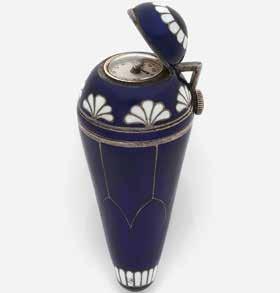 Petite montre dissimulée sous un capot émaillé bleu et blanc, dans une petite amphore en argent (925) à décors géométriques et de fleurs émaillés blancs. Mouvement à remontage mécanique.