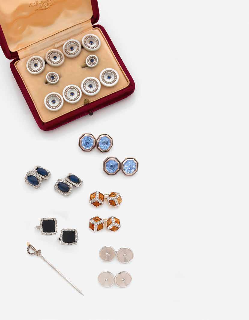 A diamond, sapphire, mother-of-pearl and 18K gold habit adornment by Bräckerbohm, circa 1920.