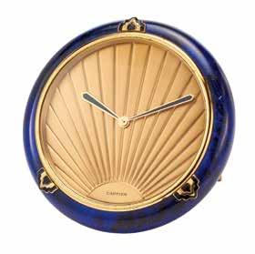 A metal and blue lacquer, quartz movement, desck clock by Cartier.