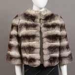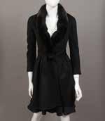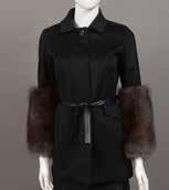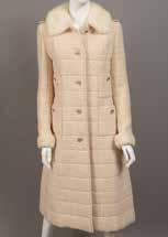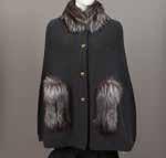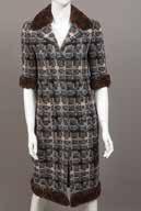 Manteau en laine et angora à dominante de gris, noir et beige, figurant des carrés, col châle cranté en lapin ainsi que le bas des manches 3/4 et le bas du manteau, simple boutonnage, quatre poches à rabat. Taille : 36