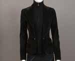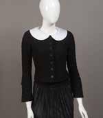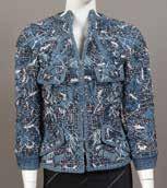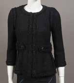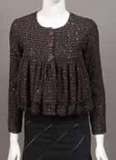 Veste en laine et coton noir effet tweed brodée de paillettes, fils de lurex, fils kaki, bordeaux et bleu marine, col rond, manches longues, simple boutonnage, sous la poitrine effet de godets et deux volants Taille : 34 - Excellent état