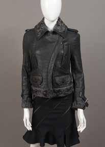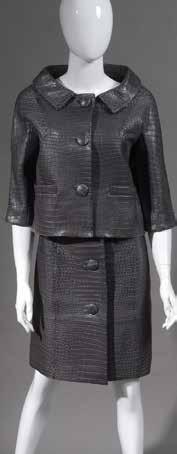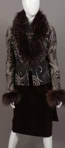 Tailleur composé d’une veste en laine et coton, dans les tons de gris/noir et marron à motif floral stylisé, col châle et poignets en fourrure. Et d’une jupe en velours marron - Taille : 38 80/120 E