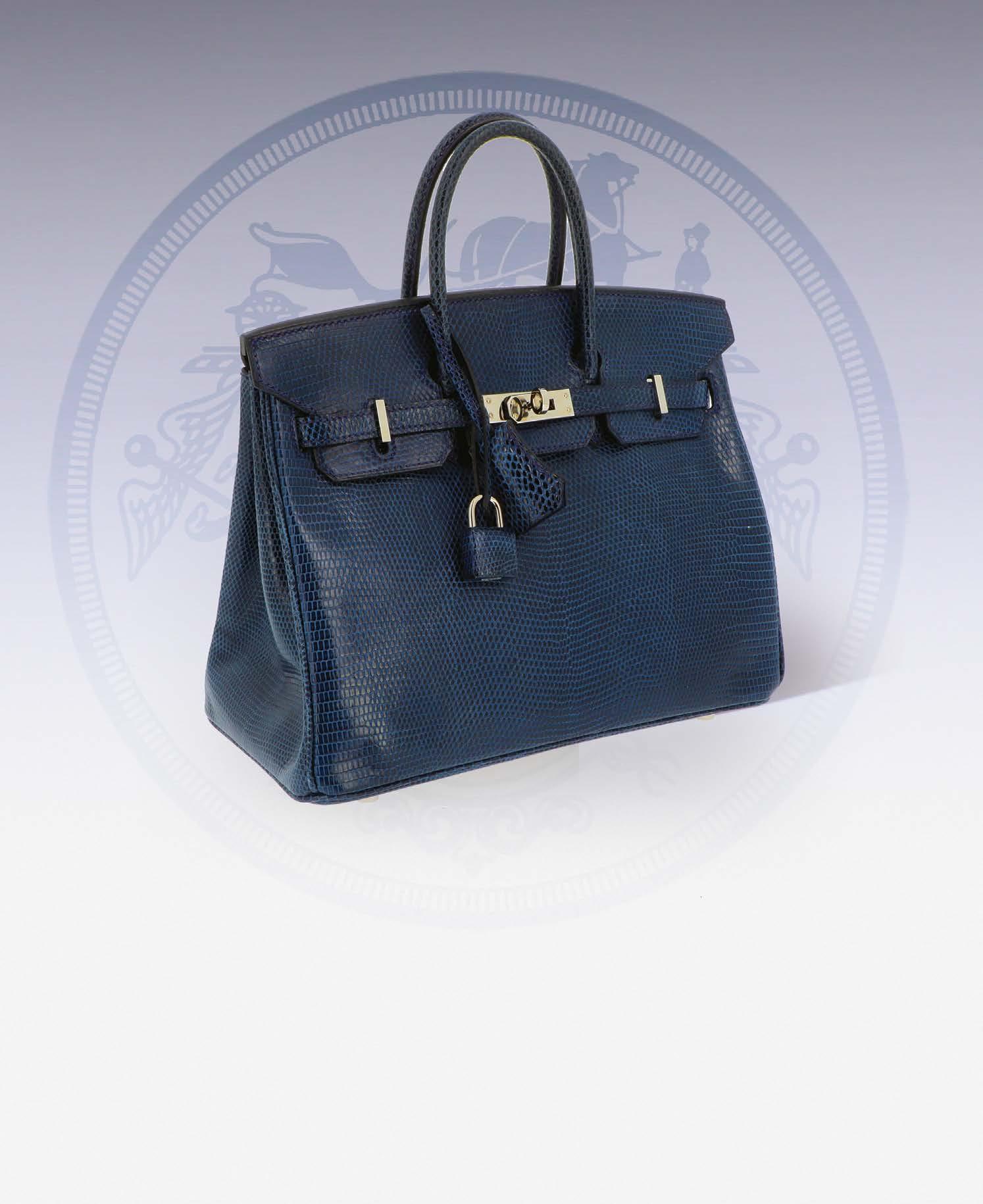 Sac «Birkin» 25 cm en lézard bleu de Prusse, garniture en métal argenté palladié, clefs, clochette, tirette, cadenas gainé, double poignée