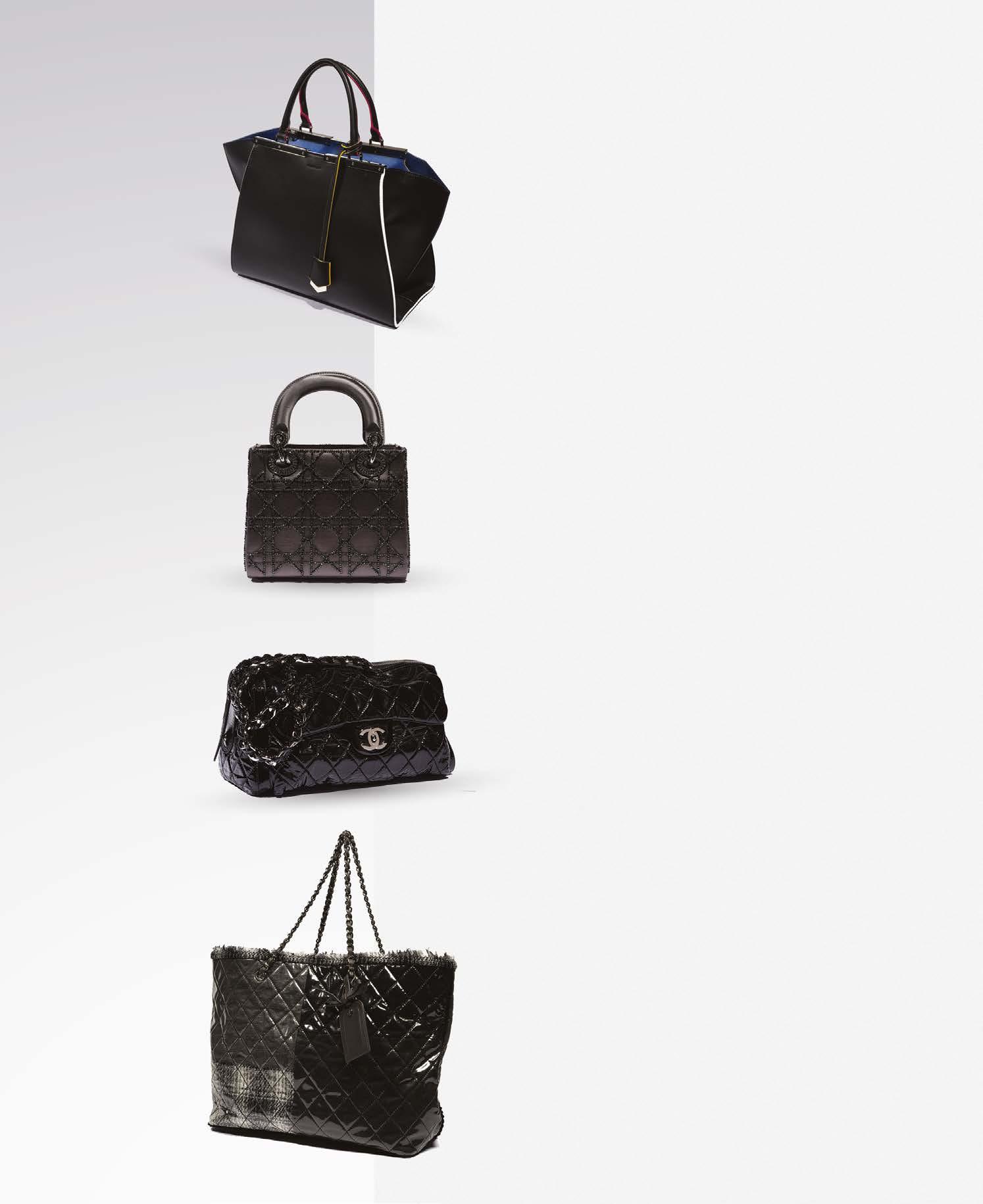 Sac 32 cm en cuir vernis matelassé noir, garniture en métal argenté, poche plaquée au dos, poche à rabat siglée devant, fermeture éclair, double demi anse chaîne tressée de cuir vernis noir.