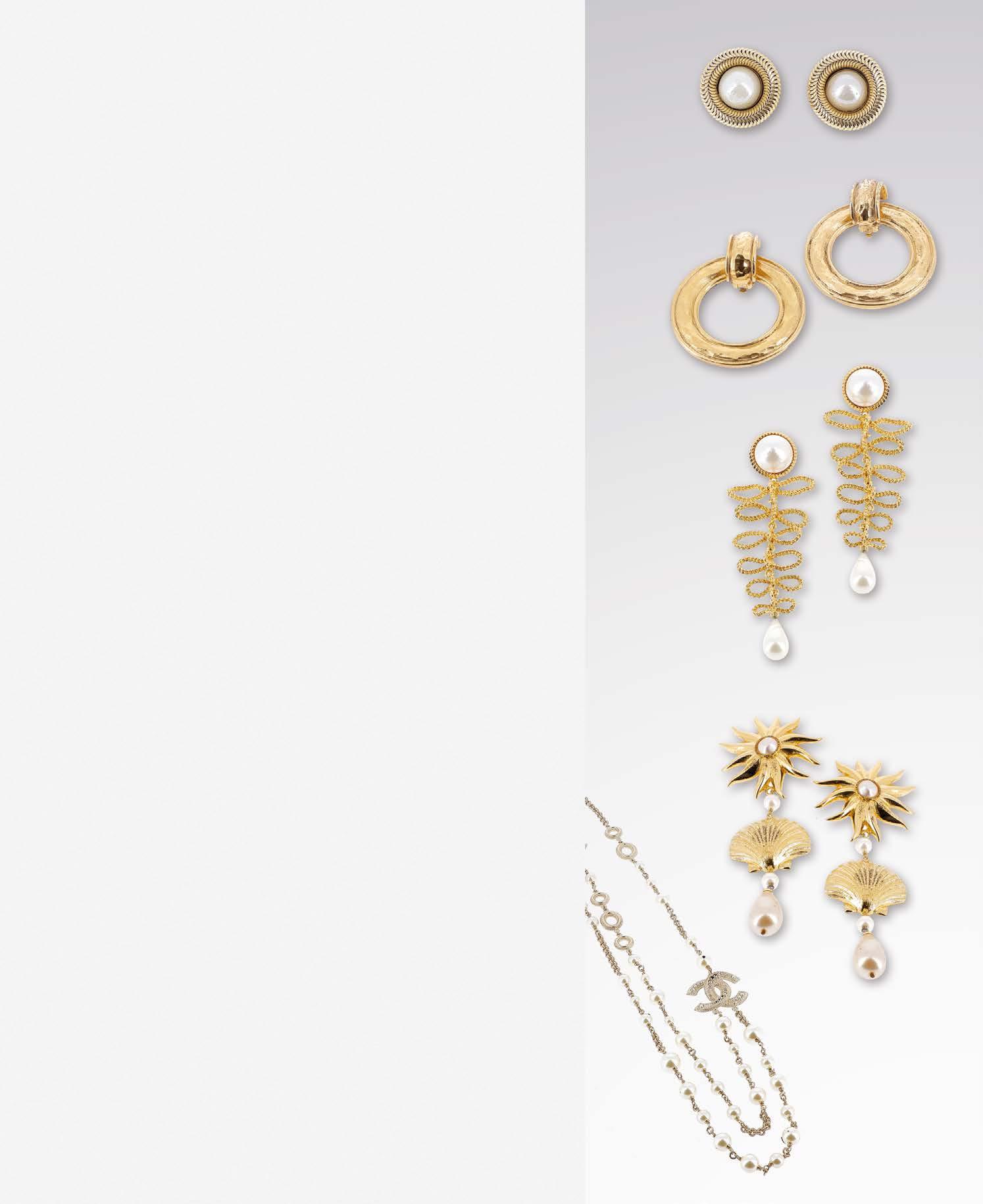 Sautoir draperie en métal doré et perles d’imitation, se divisant en deux rangs sur le devant, rehaussée de deux importants double «C»