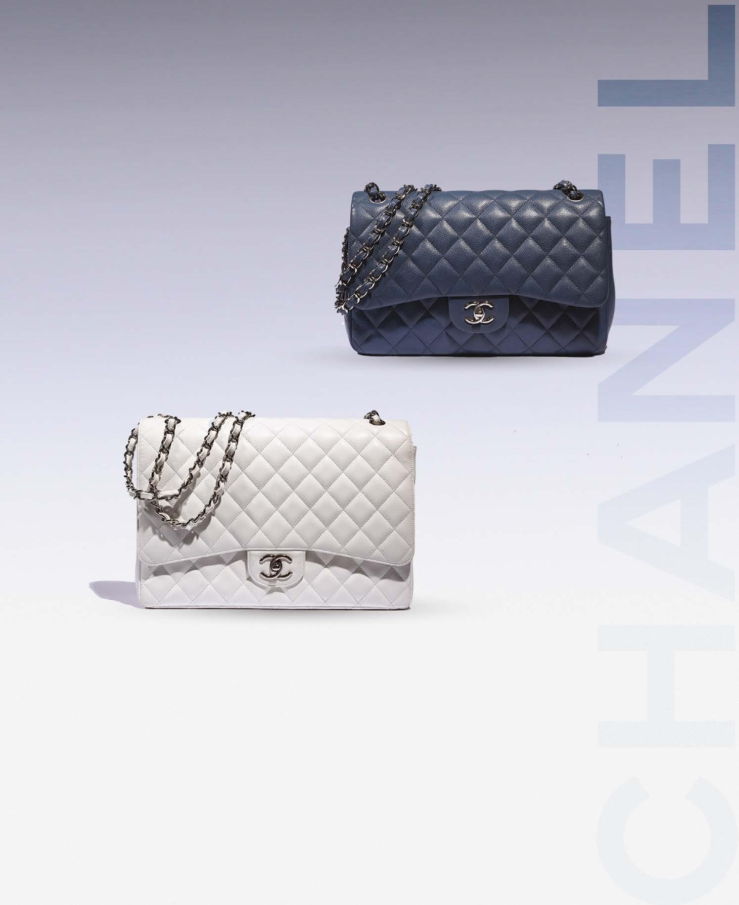 Sac «Jumbo» 33 cm en cuir caviar blanc matelassé blanc, garniture en métal argenté, fermeture siglée sur rabat, poche plaquée au dos, anse chaîne réglable entrelacée de cuir blanc