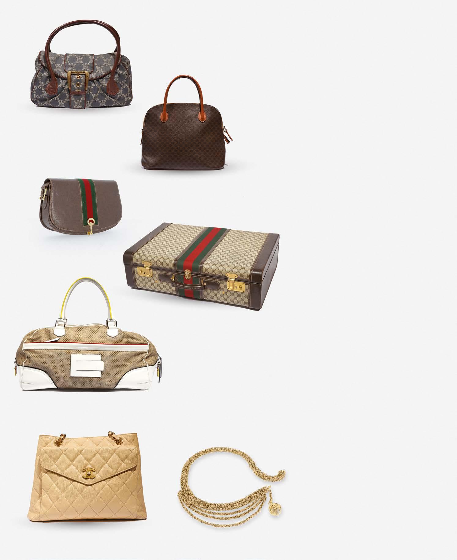 Valise en toile beige monogrammée, cuir marron, garniture en métal doré, rehaussée au centre par une bande de tissu vert et rouge, poignée