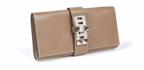 An ensemble in beige and brown leather comprising a wallet and a clutch bag, by Hermès.